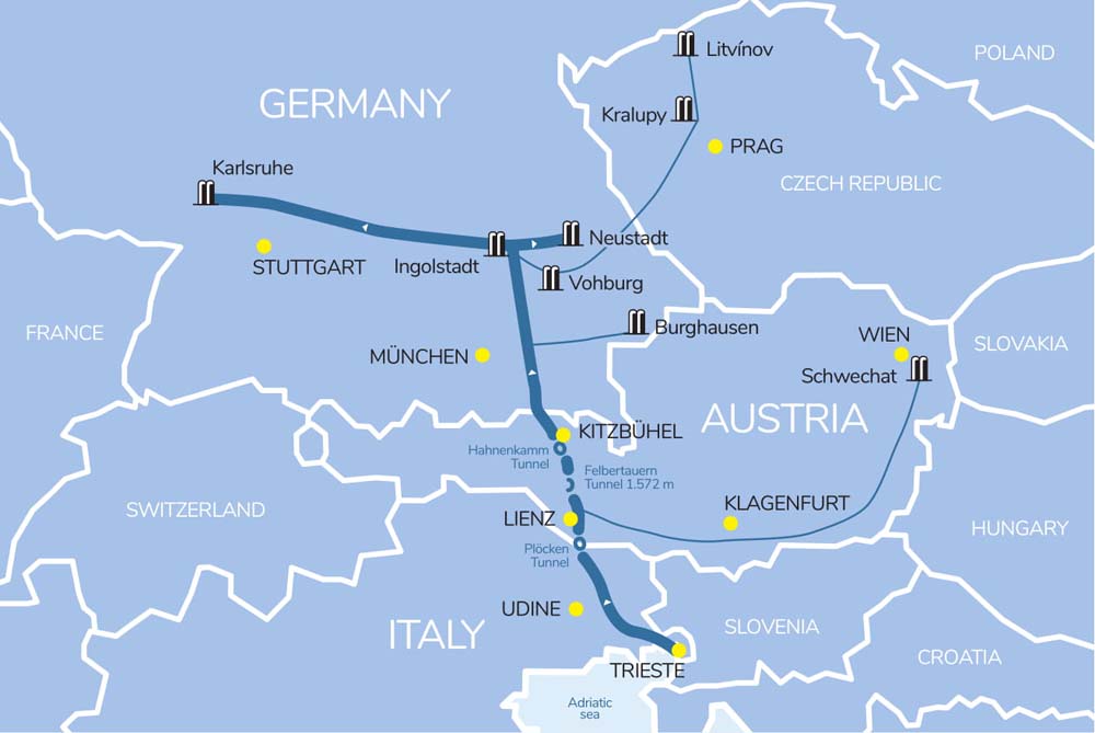 Das Rohöl legt bei seiner Reise über 465 Kilometer vom Hafen Triest bis nach Lenting bei Ingolstadt zurück und versorgt Raffinerien in Österreich, Deutschland und Tschechien.