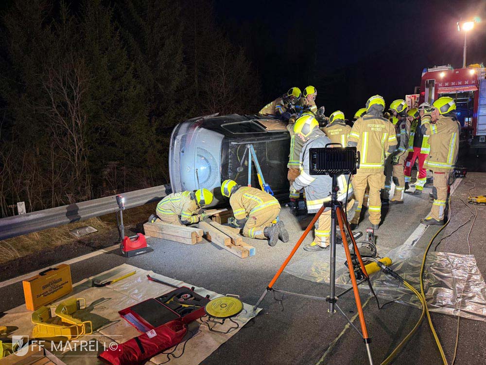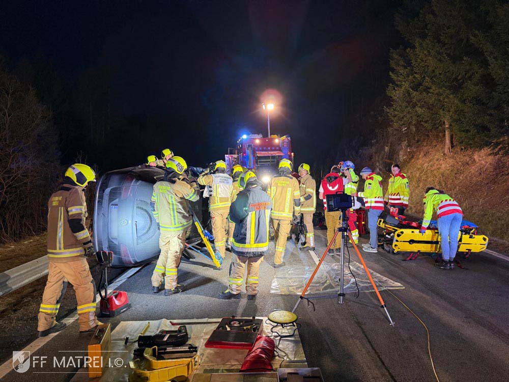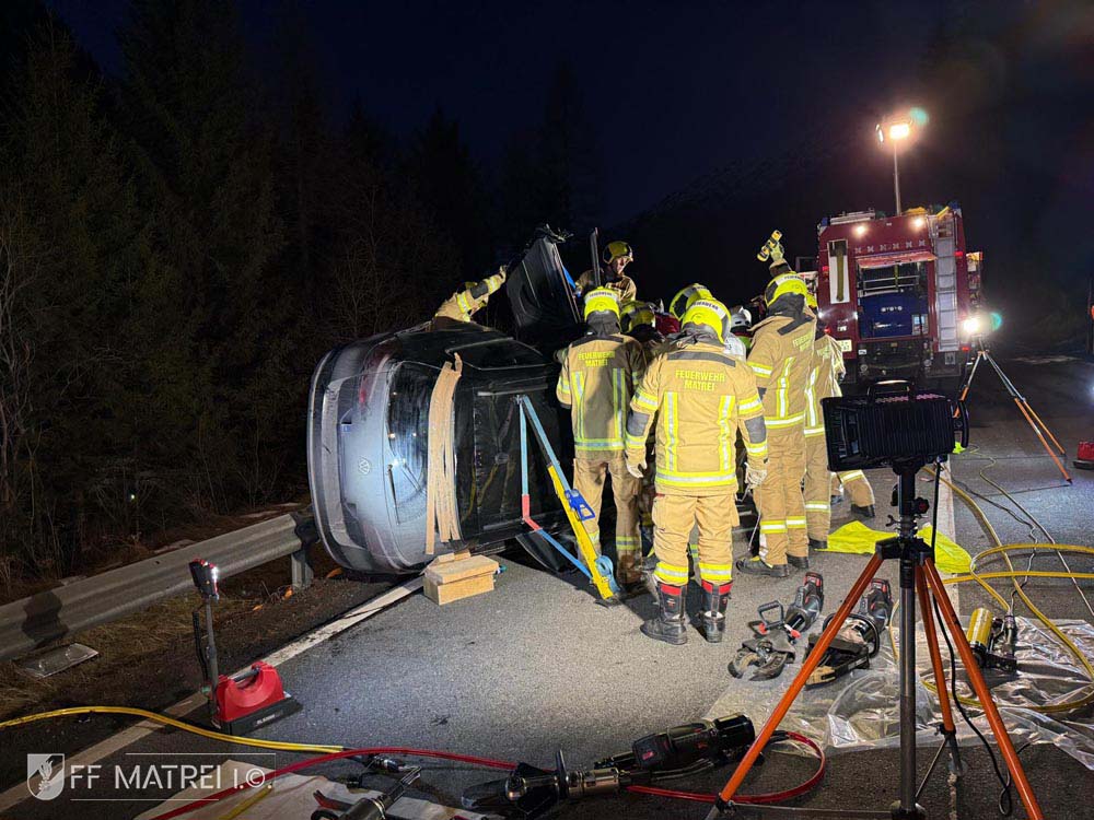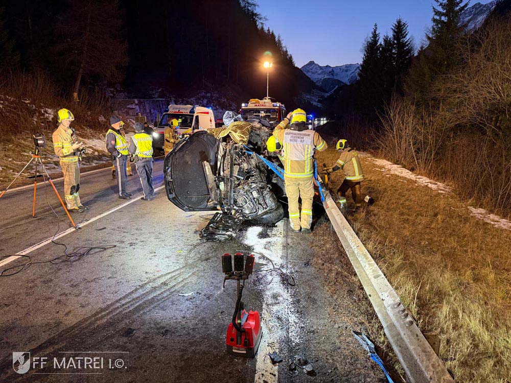 Die Feuerwehr Matrei nahm Sicherungsmaßnahmen vor, stabilisierte das Fahrzeug und konnte unter Einsatz von hydraulischem Rettungsgerät eine Person aus dem Wrack bergen und dem Roten Kreuz zur weiteren Versorgung übergeben.